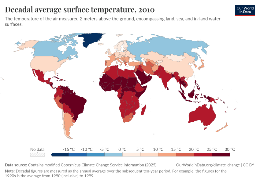 “Data Page: Decadal average surface temperature”, part of the following publication: Hannah Ritchie, Pablo Rosado, and Veronika Samborska (2024) - “Climate Change”. Data adapted from Contains modified Copernicus Climate Change Service information. Retrieved from https://auto-wildfires.owid.pages.dev:8789/20260210-110915/grapher/decadal-average-surface-temperature.html [online resource] (archived on February 10, 2026).How to cite this data