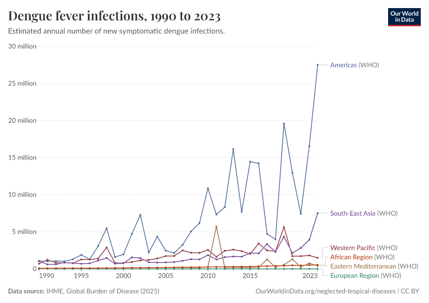 IHME, Global Burden of Disease (2025) – with major processing by Our World in Data. “Dengue fever infections” [dataset]. IHME, Global Burden of Disease, “Global Burden of Disease - Prevalence and Incidence” [original data]. Retrieved March 3, 2026 from https://auto-wildfires.owid.pages.dev:8789/20260212-172859/grapher/dengue-incidence.html (archived on February 12, 2026).
