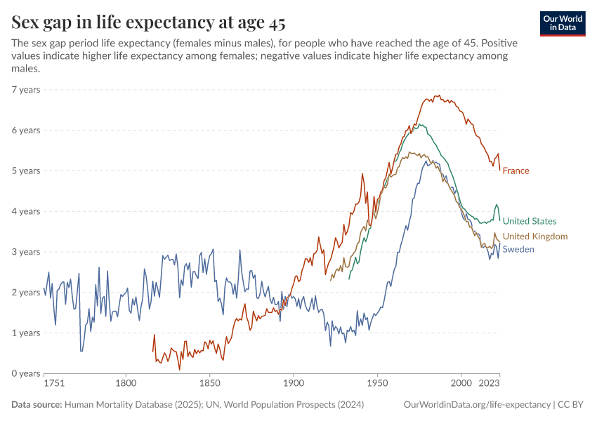 Human Mortality Database (2025); UN, World Population Prospects (2024) – with major processing by Our World in Data. “Life expectancy at 45 – HMD – female-male difference, period tables” [dataset]. Human Mortality Database, “Human Mortality Database”; United Nations, “World Population Prospects” [original data]. Retrieved March 3, 2026 from https://auto-wildfires.owid.pages.dev:8789/20251022-222946/grapher/difference-in-female-and-male-life-expectancy-at-age-45.html (archived on October 22, 2025).
