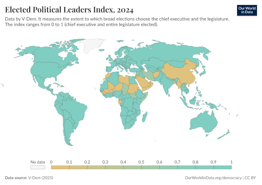V-Dem (2025) – processed by Our World in Data. “Elected officials index” [dataset]. V-Dem, “Democracy report v15” [original data]. Retrieved March 3, 2026 from https://auto-wildfires.owid.pages.dev:8789/20260119-070102/grapher/elected-political-leaders-index.html (archived on January 19, 2026).