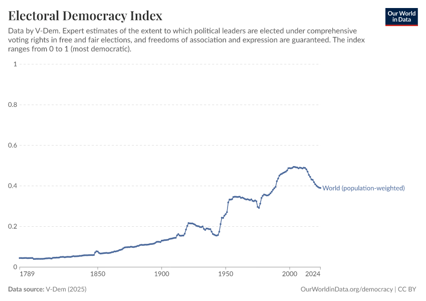 “Data Page: Electoral democracy index”, part of the following publication: Bastian Herre, Lucas Rodés-Guirao, and Esteban Ortiz-Ospina (2013) - “Democracy”. Data adapted from V-Dem. Retrieved from https://auto-wildfires.owid.pages.dev:8789/20260119-070102/grapher/electoral-democracy-index.html [online resource] (archived on January 19, 2026).How to cite this data