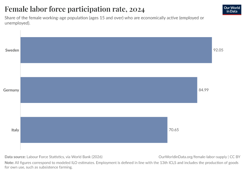 “Data Page: Female labor force participation rate”. Our World in Data (2026). Data adapted from ILO Modelled Estimates, via World Bank. Retrieved from https://auto-wildfires.owid.pages.dev:8789/20260223-234835/grapher/female-labor-force-participation-rates.html [online resource] (archived on February 23, 2026).