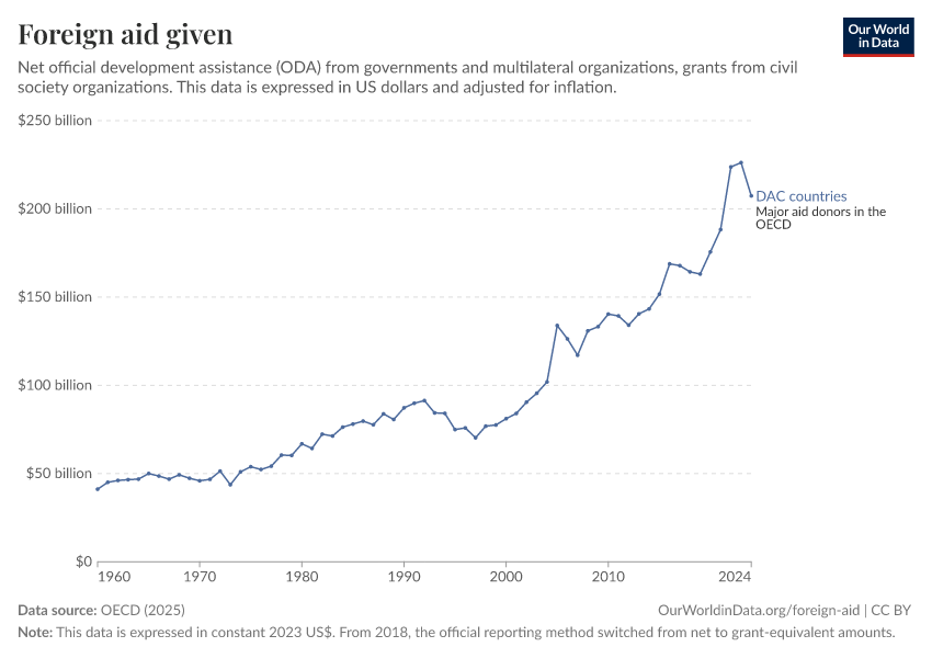 OECD (2025) – with major processing by Our World in Data. “Foreign aid given – Net disbursements” [dataset]. OECD, “OECD Official Development Assistance (ODA) - DAC1: Flows by provider (ODA+OOF+Private)”; OECD, “OECD Official Development Assistance (ODA) - DAC2A: Aid (ODA) disbursements to countries and regions” [original data]. Retrieved March 2, 2026 from https://auto-wildfires.owid.pages.dev:8789/20260223-070107/grapher/foreign-aid-given-net.html (archived on February 23, 2026).