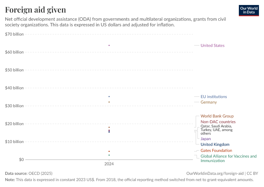 OECD (2025) – with major processing by Our World in Data. “Foreign aid given – Net disbursements” [dataset]. OECD, “OECD Official Development Assistance (ODA) - DAC1: Flows by provider (ODA+OOF+Private)”; OECD, “OECD Official Development Assistance (ODA) - DAC2A: Aid (ODA) disbursements to countries and regions” [original data]. Retrieved March 3, 2026 from https://auto-wildfires.owid.pages.dev:8789/20260223-070107/grapher/foreign-aid-given-net.html (archived on February 23, 2026).
