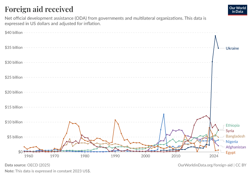 OECD (2025) – with major processing by Our World in Data. “Foreign aid received – Official donors” [dataset]. OECD, “OECD Official Development Assistance (ODA) - DAC2A: Aid (ODA) disbursements to countries and regions” [original data]. Retrieved March 2, 2026 from https://auto-wildfires.owid.pages.dev:8789/20260223-070107/grapher/foreign-aid-received-net.html (archived on February 23, 2026).