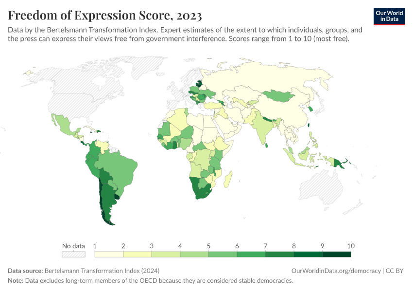 “Data Page: Freedom of Expression Score”, part of the following publication: Bastian Herre, Lucas Rodés-Guirao, and Esteban Ortiz-Ospina (2013) - “Democracy”. Data adapted from Bertelsmann Transformation Index. Retrieved from https://auto-wildfires.owid.pages.dev:8789/20260204-165456/grapher/freedom-of-expression-score-bti.html [online resource] (archived on February 4, 2026).How to cite this data