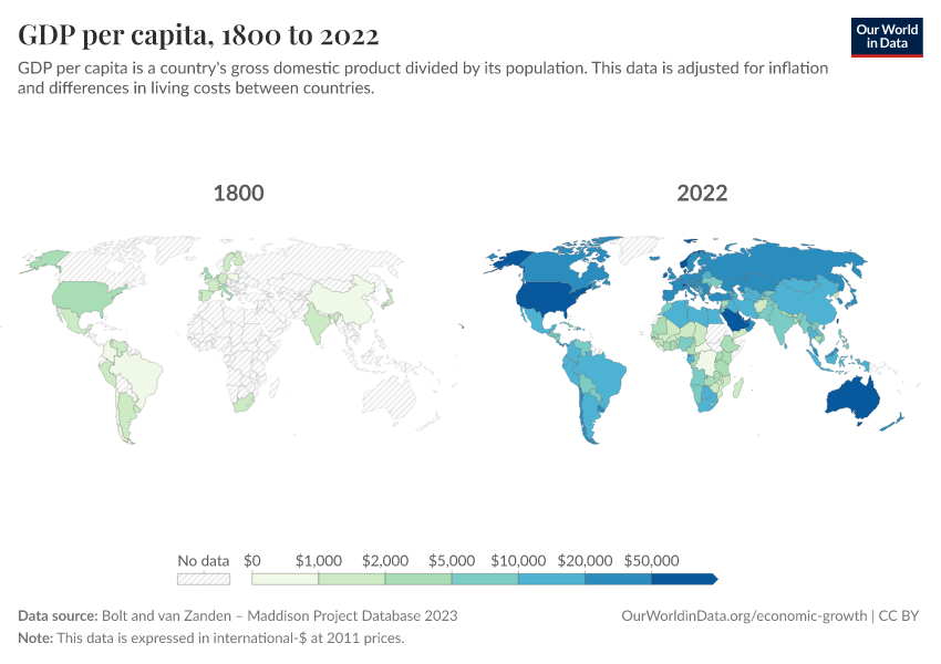 “Data Page: GDP per capita”, part of the following publication: Max Roser, Bertha Rohenkohl, Pablo Arriagada, Joe Hasell, Hannah Ritchie, and Esteban Ortiz-Ospina (2023) - “Economic Growth”. Data adapted from Bolt and van Zanden. Retrieved from https://auto-wildfires.owid.pages.dev:8789/20251111-144738/grapher/gdp-per-capita-maddison-project-database.html [online resource] (archived on November 11, 2025).How to cite this data