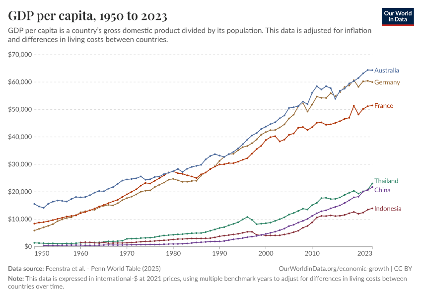 “Data Page: GDP per capita”, part of the following publication: Max Roser, Bertha Rohenkohl, Pablo Arriagada, Joe Hasell, Hannah Ritchie, and Esteban Ortiz-Ospina (2023) - “Economic Growth”. Data adapted from Feenstra et al.. Retrieved from https://auto-wildfires.owid.pages.dev:8789/20251013-111729/grapher/gdp-per-capita-penn-world-table.html [online resource] (archived on October 13, 2025).How to cite this data