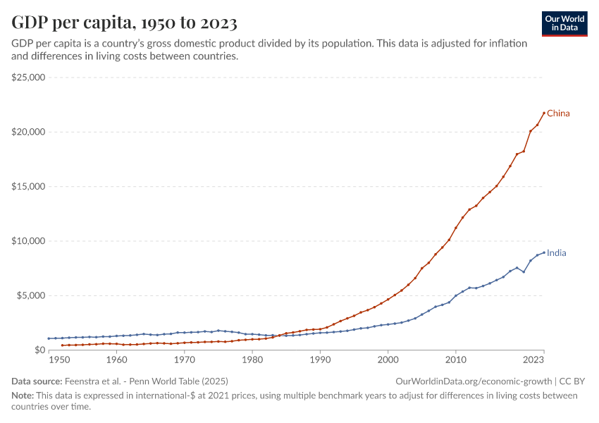 “Data Page: GDP per capita”, part of the following publication: Max Roser, Bertha Rohenkohl, Pablo Arriagada, Joe Hasell, Hannah Ritchie, and Esteban Ortiz-Ospina (2023) - “Economic Growth”. Data adapted from Feenstra et al.. Retrieved from https://auto-wildfires.owid.pages.dev:8789/20251013-111729/grapher/gdp-per-capita-penn-world-table.html [online resource] (archived on October 13, 2025).How to cite this data