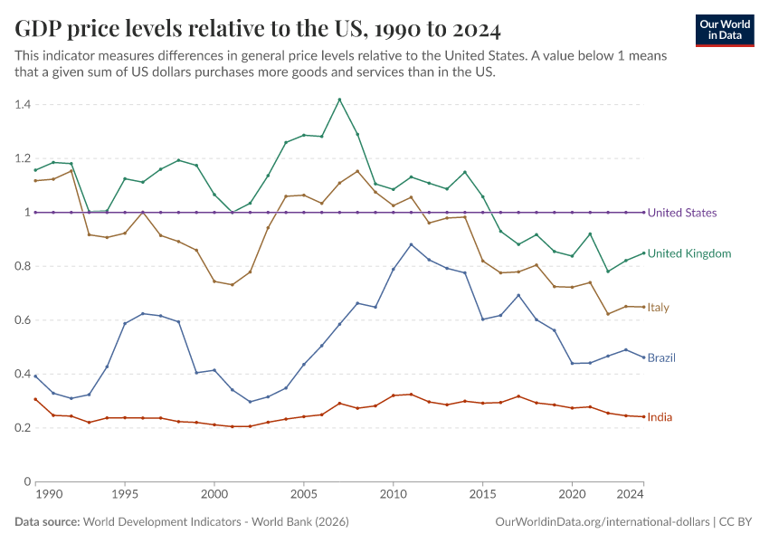 World Development Indicators - World Bank (2026) – processed by Our World in Data. “GDP price levels relative to the US – World Bank” [dataset]. World Development Indicators - World Bank, “World Development Indicators 125” [original data]. Retrieved March 3, 2026 from https://auto-wildfires.owid.pages.dev:8789/20260202-180243/grapher/gdp-price-levels-relative-to-the-us.html (archived on February 2, 2026).