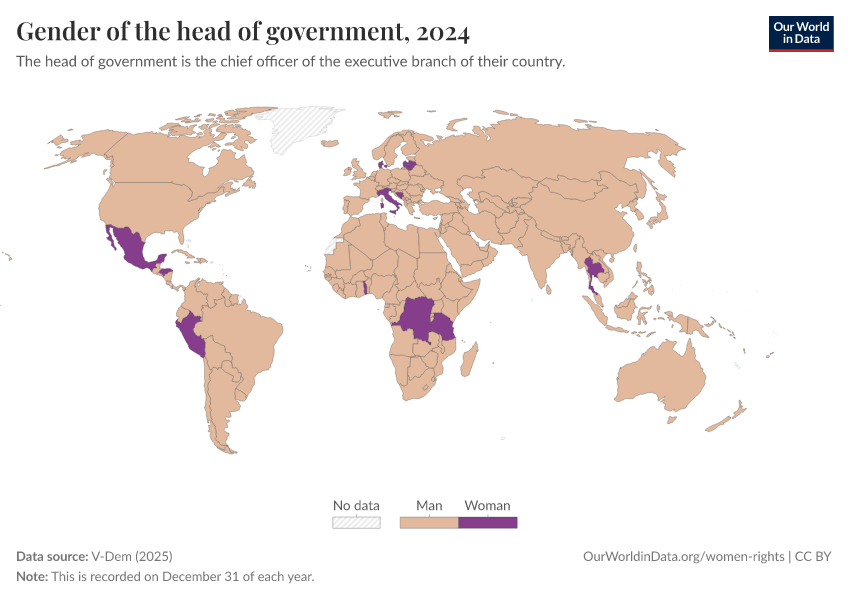 “Data Page: Gender of the head of government”, part of the following publication: Bastian Herre, Lucas Rodés-Guirao, and Esteban Ortiz-Ospina (2013) - “Democracy”. Data adapted from V-Dem. Retrieved from https://auto-wildfires.owid.pages.dev:8789/20260119-070102/grapher/gender-of-the-head-of-government.html [online resource] (archived on January 19, 2026).How to cite this data