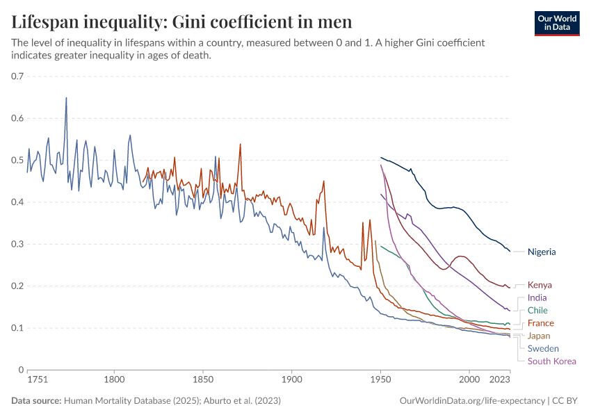 “Data Page: Lifespan inequality: Gini coefficient in men”, part of the following publication: Saloni Dattani, Lucas Rodés-Guirao, Hannah Ritchie, Esteban Ortiz-Ospina, and Max Roser (2023) - “Life Expectancy”. Data adapted from Human Mortality Database, United Nations. Retrieved from https://auto-wildfires.owid.pages.dev:8789/20251022-222946/grapher/gini-coefficient-of-lifespan-inequality-in-males.html [online resource] (archived on October 22, 2025).How to cite this data
