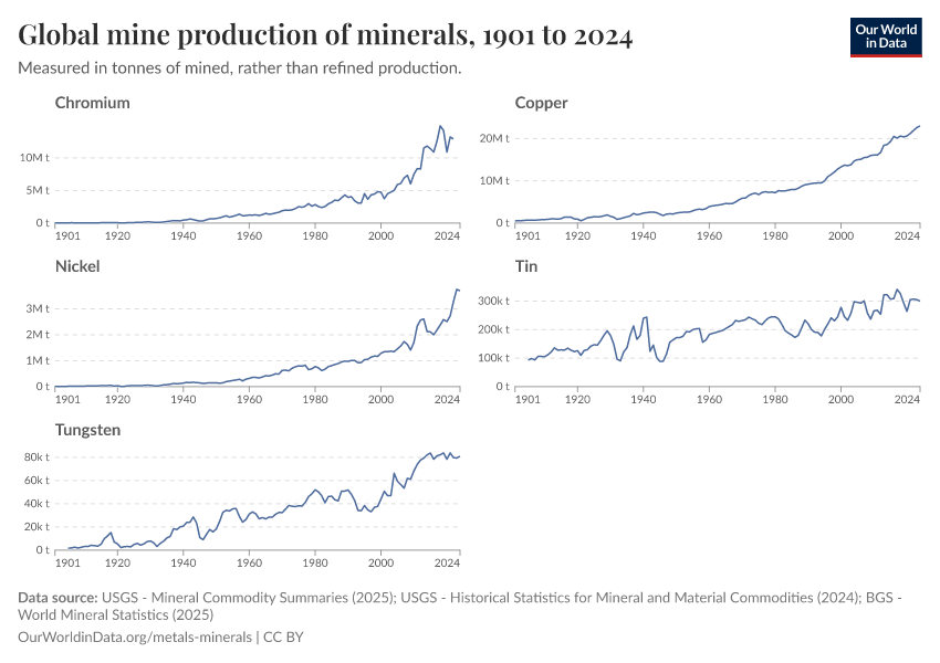 USGS - Mineral Commodity Summaries (2025); USGS - Historical Statistics for Mineral and Material Commodities (2024); BGS - World Mineral Statistics (2025) – with major processing by Our World in Data. “Global mine production of minerals” [dataset]. United States Geological Survey, “Mineral Commodity Summaries”; United States Geological Survey, “Historical Statistics for Mineral and Material Commodities”; British Geological Survey, “World Mineral Statistics” [original data]. Retrieved March 3, 2026 from https://auto-wildfires.owid.pages.dev:8789/20260116-170644/grapher/global-mine-production-minerals.html (archived on January 16, 2026).