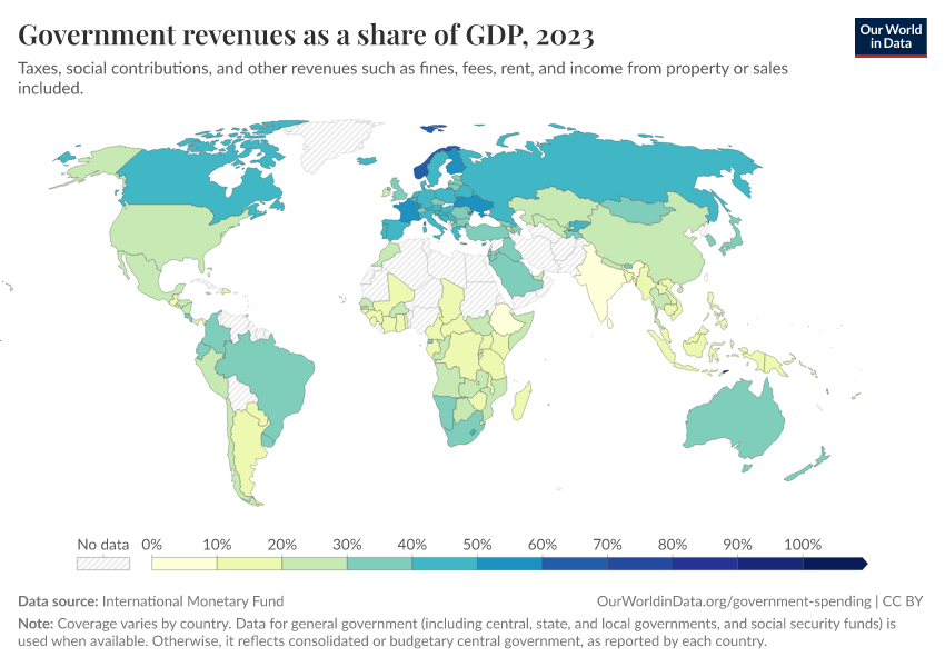 International Monetary Fund – with minor processing by Our World in Data. “Government revenues as a share of GDP” [dataset]. International Monetary Fund, “IMF” [original data]. Retrieved March 2, 2026 from https://auto-wildfires.owid.pages.dev:8789/20251120-211749/grapher/government-revenues-as-a-share-of-gdp-imf.html (archived on November 20, 2025).