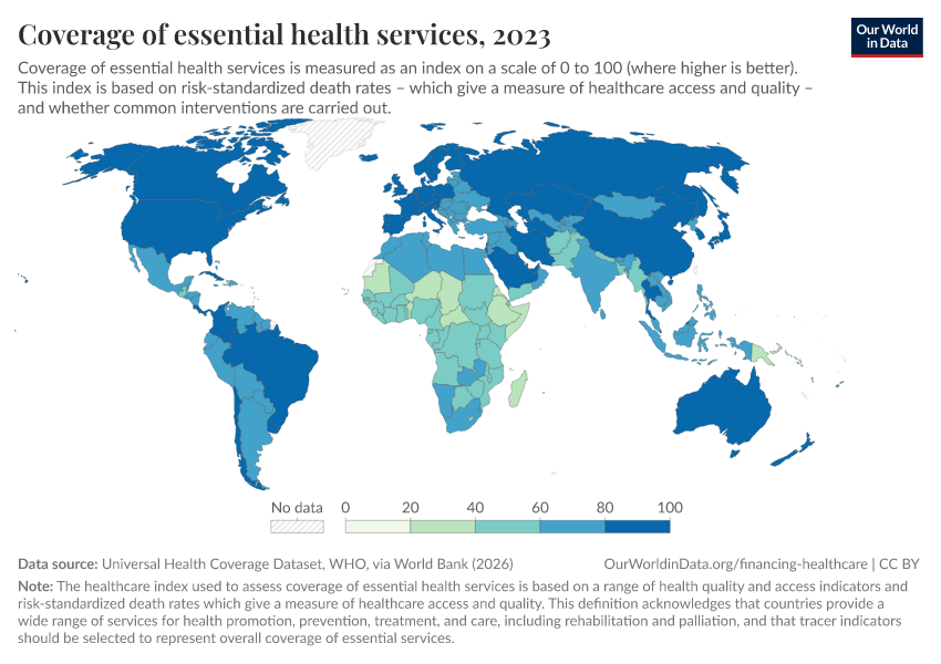 “Data Page: Coverage of essential health services”. Our World in Data (2026). Data adapted from Universal Health Coverage Dataset, WHO, via World Bank. Retrieved from https://auto-wildfires.owid.pages.dev:8789/20260202-181317/grapher/healthcare-access-quality-un.html [online resource] (archived on February 2, 2026).How to cite this data