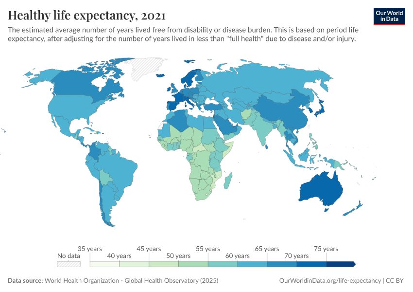“Data Page: Healthy life expectancy”. Our World in Data (2026). Data adapted from World Health Organization. Retrieved from https://auto-wildfires.owid.pages.dev:8789/20260119-070102/grapher/healthy-life-expectancy-at-birth.html [online resource] (archived on January 19, 2026).How to cite this data