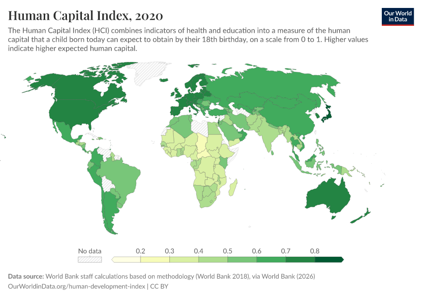 “Data Page: Human Capital Index”. Our World in Data (2026). Data adapted from World Bank staff calculations based on methodology (World Bank 2018), via World Bank. Retrieved from https://auto-wildfires.owid.pages.dev:8789/20260202-181317/grapher/human-capital-index-in-2018.html [online resource] (archived on February 2, 2026).How to cite this data