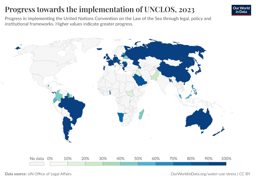“Data Page: Progress towards the implementation of UNCLOS”. Our World in Data (2026). Data adapted from UN Office of Legal Affairs. Retrieved from https://auto-wildfires.owid.pages.dev:8789/20251120-211749/grapher/implementation-of-unclos.html [online resource] (archived on November 20, 2025).How to cite this data