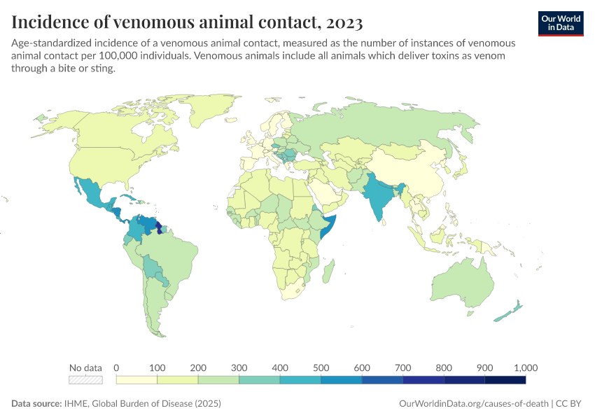 “Data Page: Incidence of venomous animal contact”, part of the following publication: Esteban Ortiz-Ospina and Max Roser (2016) - “Global Health”. Data adapted from IHME, Global Burden of Disease. Retrieved from https://auto-wildfires.owid.pages.dev:8789/20260212-172132/grapher/incidence-of-venomous-animal-contact.html [online resource] (archived on February 12, 2026).How to cite this data