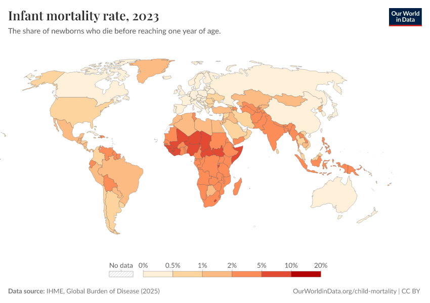 IHME, Global Burden of Disease (2025) – with minor processing by Our World in Data. “Infant mortality rate” [dataset]. IHME, Global Burden of Disease, “Global Burden of Disease - Child Mortality” [original data]. Retrieved March 2, 2026 from https://auto-wildfires.owid.pages.dev:8789/20260213-140117/grapher/infant-mortality-rate.html (archived on February 13, 2026).