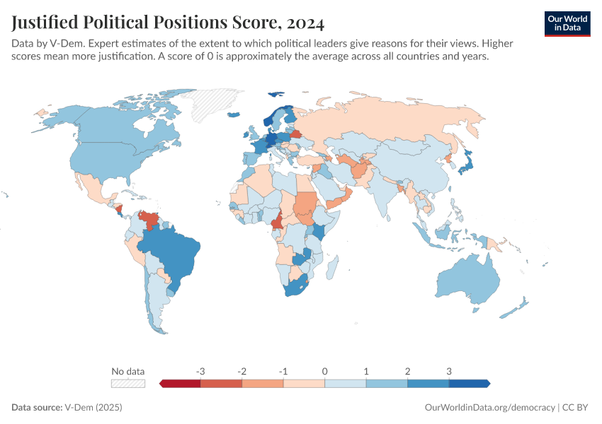 V-Dem (2025) – processed by Our World in Data. “Justified political positions – V-Dem” [dataset]. V-Dem, “Democracy report v15” [original data]. Retrieved March 2, 2026 from https://auto-wildfires.owid.pages.dev:8789/20260204-170225/grapher/justified-political-positions-score.html (archived on February 4, 2026).