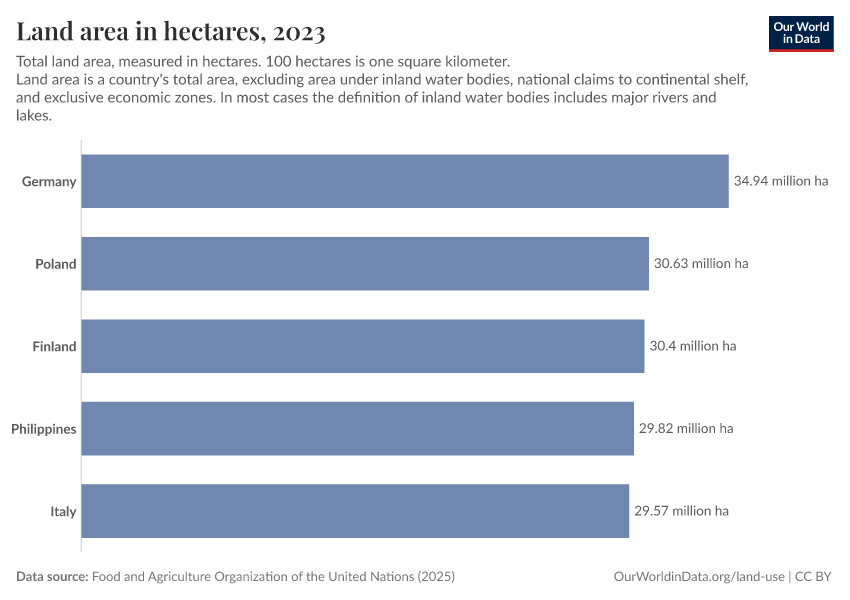 “Data Page: Land area in hectares”, part of the following publication: Hannah Ritchie, Pablo Rosado, and Max Roser (2023) - “Agricultural Production”. Data adapted from Food and Agriculture Organization of the United Nations. Retrieved from https://auto-wildfires.owid.pages.dev:8789/20260226-122020/grapher/land-area-hectares.html [online resource] (archived on February 26, 2026).