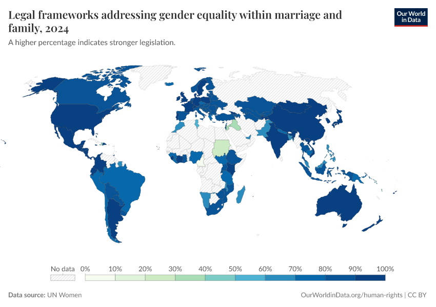 “Data Page: Legal frameworks addressing gender equality within marriage and family”. Our World in Data (2026). Data adapted from UN Women. Retrieved from https://auto-wildfires.owid.pages.dev:8789/20260130-180113/grapher/legal-frameworks-gender-equality-within-marriage-and-family.html [online resource] (archived on January 30, 2026).How to cite this data
