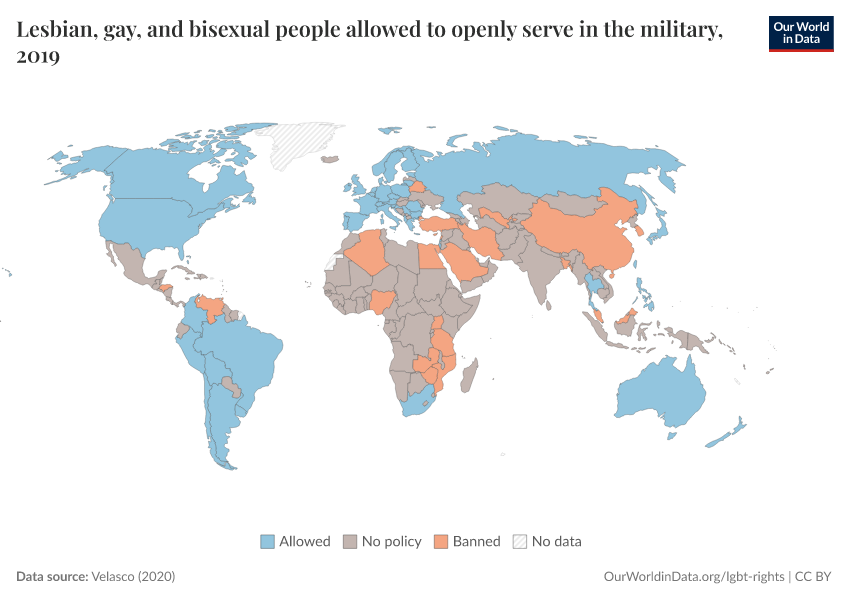 “Data Page: Lesbian, gay, and bisexual people allowed to openly serve in the military”, part of the following publication: Bastian Herre and Pablo Arriagada (2023) - “LGBT+ Rights”. Data adapted from Velasco. Retrieved from https://auto-wildfires.owid.pages.dev:8789/20251023-195030/grapher/lgb-military-velasco.html [online resource] (archived on October 23, 2025).How to cite this data