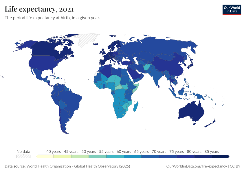 “Data Page: Life expectancy”. Our World in Data (2026). Data adapted from World Health Organization. Retrieved from https://auto-wildfires.owid.pages.dev:8789/20260119-070102/grapher/life-expectancy-at-birth-who-gho.html [online resource] (archived on January 19, 2026).How to cite this data