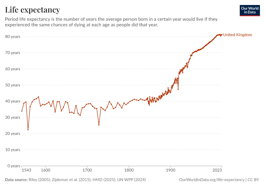 Riley (2005); Zijdeman et al. (2015); HMD (2025); UN WPP (2024) – with major processing by Our World in Data. “Life expectancy – Riley; Zijdeman et al.; HMD; UN WPP – Long-run data” [dataset]. Human Mortality Database, “Human Mortality Database”; United Nations, “World Population Prospects”; Zijdeman et al., “Life Expectancy at birth v2”; James C. Riley, “Estimates of Regional and Global Life Expectancy, 1800-2001” [original data]. Retrieved March 3, 2026 from https://auto-wildfires.owid.pages.dev:8789/20260225-014904/grapher/life-expectancy.html (archived on February 25, 2026).
