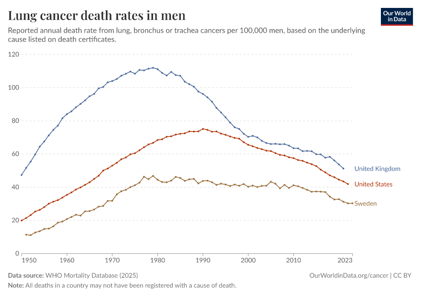 “Data Page: Lung cancer death rates in men”, part of the following publication: Saloni Dattani, Fiona Spooner, Hannah Ritchie, and Max Roser (2023) - “Causes of Death”. Data adapted from WHO Mortality Database. Retrieved from https://auto-wildfires.owid.pages.dev:8789/20250909-093708/grapher/lung-cancer-death-rates-males.html [online resource] (archived on September 9, 2025).How to cite this data