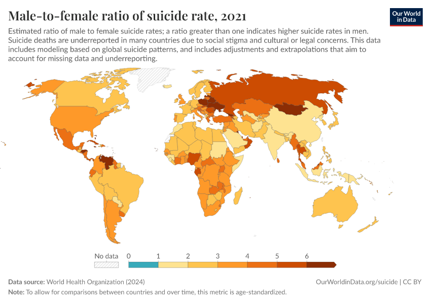 World Health Organization (2024) – with major processing by Our World in Data. “Male-to-female ratio of suicide rate” [dataset]. World Health Organization, “Global Health Estimates” [original data]. Retrieved March 2, 2026 from https://auto-wildfires.owid.pages.dev:8789/20250909-093708/grapher/male-female-ratio-suicides-rates.html (archived on September 9, 2025).