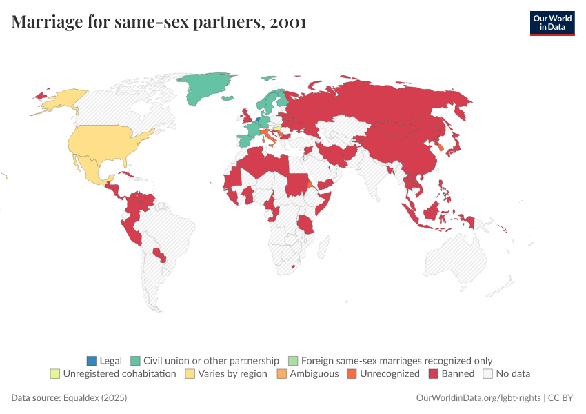 “Data Page: Marriage for same-sex partners”, part of the following publication: Bastian Herre and Pablo Arriagada (2023) - “LGBT+ Rights”. Data adapted from Equaldex. Retrieved from https://auto-wildfires.owid.pages.dev:8789/20250909-093708/grapher/marriage-same-sex-partners-equaldex.html [online resource] (archived on September 9, 2025).How to cite this data