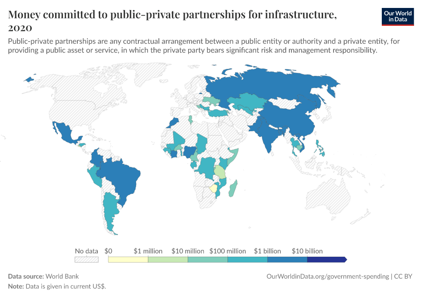 “Data Page: Money committed to public-private partnerships for infrastructure”. Our World in Data (2026). Data adapted from World Bank. Retrieved from https://auto-wildfires.owid.pages.dev:8789/20251120-211749/grapher/money-committed-to-public-private-partnerships-for-infrastructure.html [online resource] (archived on November 20, 2025).How to cite this data