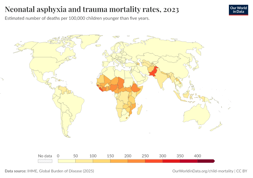 IHME, Global Burden of Disease (2025) – with major processing by Our World in Data. “Neonatal asphyxia and trauma mortality rates” [dataset]. IHME, Global Burden of Disease, “Global Burden of Disease - Deaths” [original data]. Retrieved March 3, 2026 from https://auto-wildfires.owid.pages.dev:8789/20260211-174736/grapher/mortality-neonatal-asphyxia-and-trauma.html (archived on February 11, 2026).