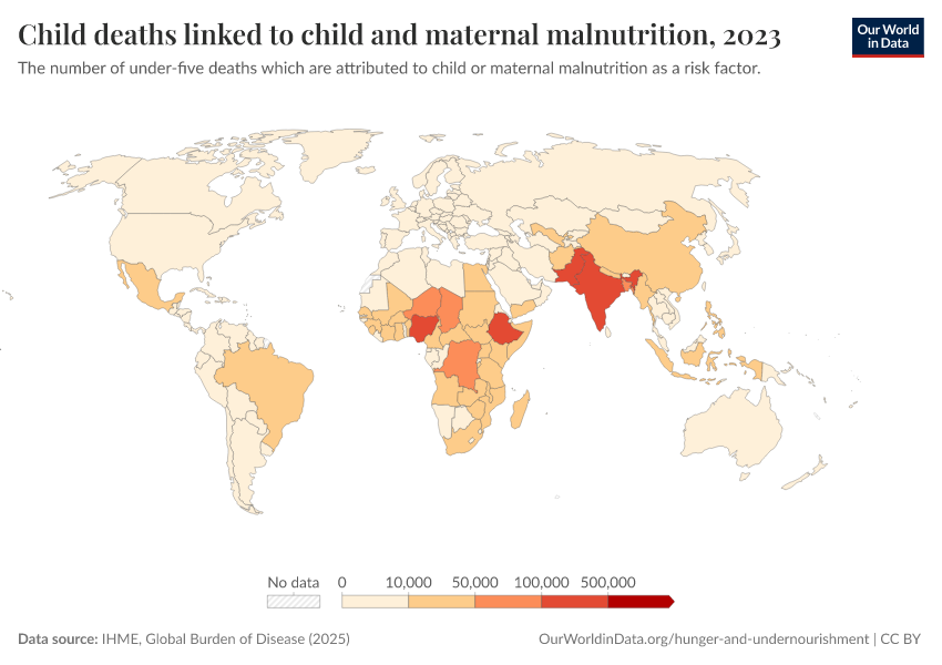 IHME, Global Burden of Disease (2025) – with major processing by Our World in Data. “Child deaths linked to child and maternal malnutrition” [dataset]. IHME, Global Burden of Disease, “Global Burden of Disease - Risk Factors - Deaths” [original data]. Retrieved March 3, 2026 from https://auto-wildfires.owid.pages.dev:8789/20260213-112438/grapher/number-child-deaths-malnutrition.html (archived on February 13, 2026).