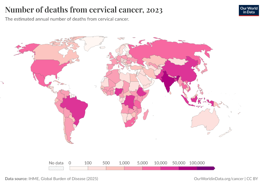 “Data Page: Number of deaths from cervical cancer”, part of the following publication: Esteban Ortiz-Ospina and Max Roser (2016) - “Global Health”. Data adapted from IHME, Global Burden of Disease. Retrieved from https://auto-wildfires.owid.pages.dev:8789/20260211-174736/grapher/number-of-deaths-from-cervical-cancer.html [online resource] (archived on February 11, 2026).How to cite this data