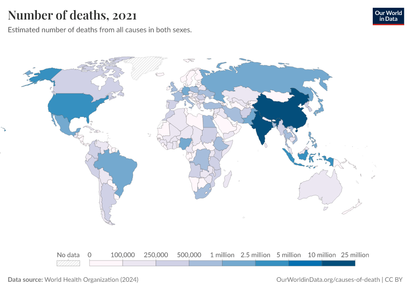 “Data Page: Number of deaths”, part of the following publication: Esteban Ortiz-Ospina and Max Roser (2016) - “Global Health”. Data adapted from World Health Organization. Retrieved from https://auto-wildfires.owid.pages.dev:8789/20250909-093708/grapher/number-of-deaths-who.html [online resource] (archived on September 9, 2025).How to cite this data