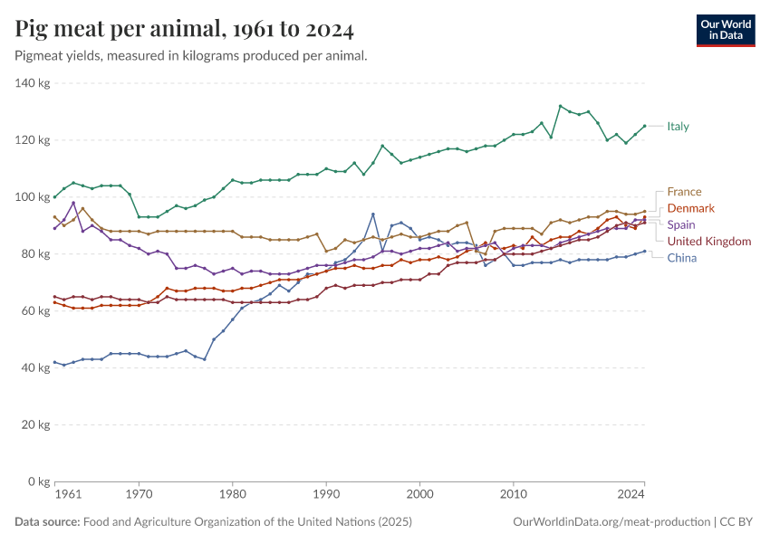 “Data Page: Pig meat yield per animal”, part of the following publication: Hannah Ritchie, Pablo Rosado, and Max Roser (2023) - “Agricultural Production”. Data adapted from Food and Agriculture Organization of the United Nations. Retrieved from https://auto-wildfires.owid.pages.dev:8789/20260226-122020/grapher/pig-yields-meat-per-animal-in-hectograms-100-grams.html [online resource] (archived on February 26, 2026).How to cite this data