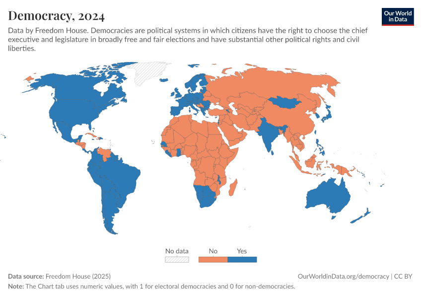 “Data Page: Democracy”, part of the following publication: Bastian Herre, Lucas Rodés-Guirao, and Esteban Ortiz-Ospina (2013) - “Democracy”. Data adapted from Freedom House. Retrieved from https://auto-wildfires.owid.pages.dev:8789/20260119-070102/grapher/political-regime-dem-fh.html [online resource] (archived on January 19, 2026).How to cite this data