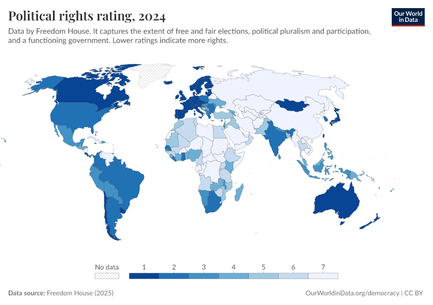 Freedom House (2025) – processed by Our World in Data. “Political rights rating” [dataset]. Freedom House, “Freedom in the World” [original data]. Retrieved March 2, 2026 from https://auto-wildfires.owid.pages.dev:8789/20260119-070102/grapher/political-rights-rating-fh.html (archived on January 19, 2026).
