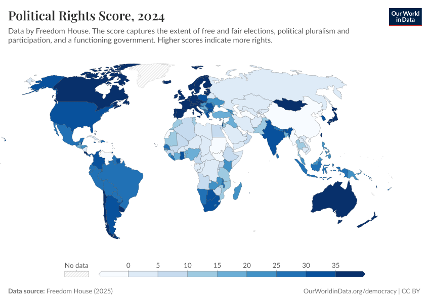 Freedom House (2025) – processed by Our World in Data. “Political Rights Score” [dataset]. Freedom House, “Freedom in the World” [original data]. Retrieved March 3, 2026 from https://auto-wildfires.owid.pages.dev:8789/20260204-170225/grapher/political-rights-score-fh.html (archived on February 4, 2026).