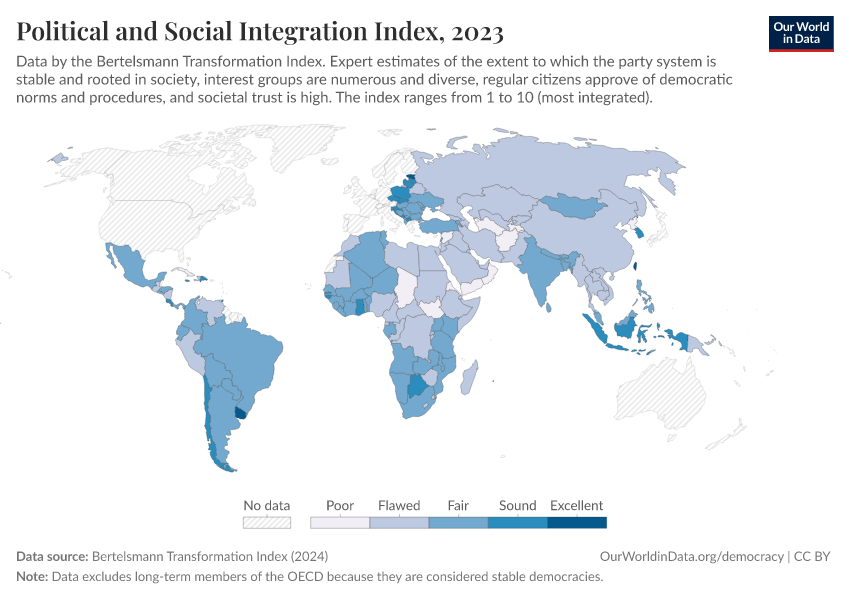 “Data Page: Political and Social Integration Index”, part of the following publication: Bastian Herre, Lucas Rodés-Guirao, and Esteban Ortiz-Ospina (2013) - “Democracy”. Data adapted from Bertelsmann Transformation Index. Retrieved from https://auto-wildfires.owid.pages.dev:8789/20260105-133053/grapher/political-social-integration-index-bti.html [online resource] (archived on January 5, 2026).How to cite this data