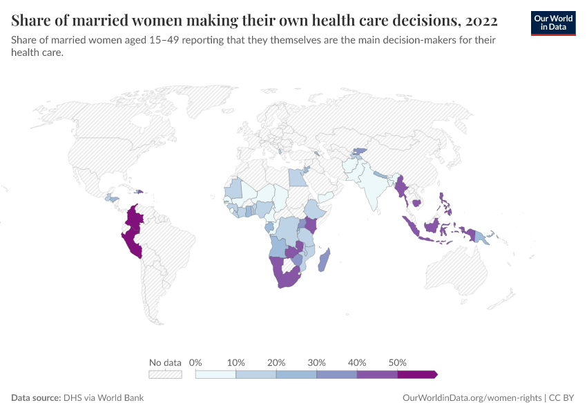 “Data Page: Share of married women making their own health care decisions”, part of the following publication: Bastian Herre, Veronika Samborska, Pablo Arriagada, and Hannah Ritchie (2023) - “Women’s Rights”. Data adapted from World Bank Gender Statistics. Retrieved from https://auto-wildfires.owid.pages.dev:8789/20250916-204433/grapher/proportion-of-women-who-make-their-own-informed-health-care-decisions.html [online resource] (archived on September 16, 2025).How to cite this data
