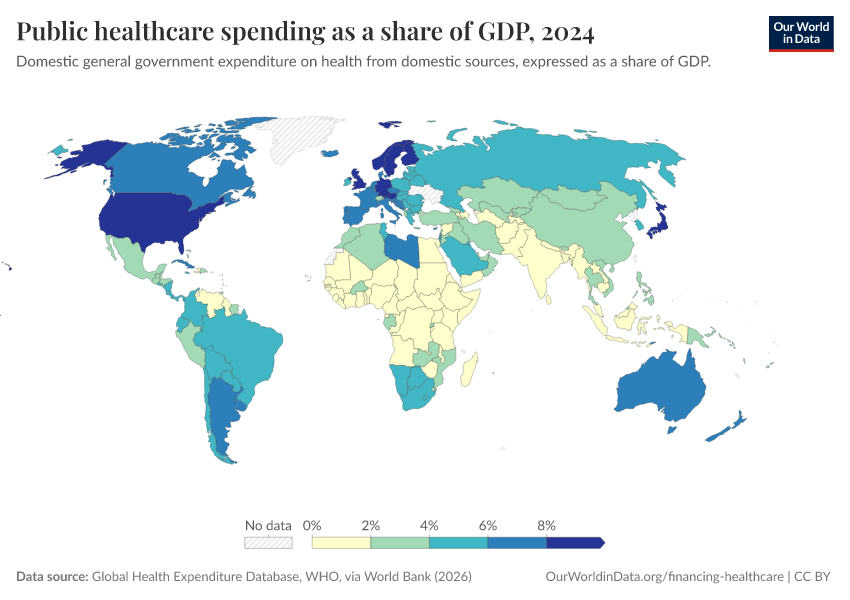 “Data Page: Public healthcare spending as a share of GDP”. Our World in Data (2026). Data adapted from Global Health Expenditure Database, WHO, via World Bank. Retrieved from https://auto-wildfires.owid.pages.dev:8789/20260202-181317/grapher/public-healthcare-spending-share-gdp.html [online resource] (archived on February 2, 2026).How to cite this data