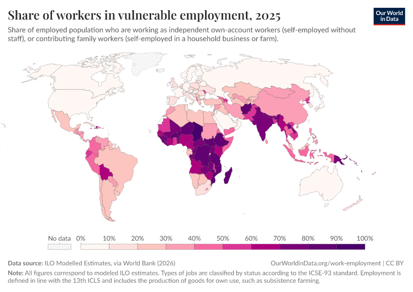 “Data Page: Share of workers in vulnerable employment”. Our World in Data (2026). Data adapted from ILO Modelled Estimates, via World Bank. Retrieved from https://auto-wildfires.owid.pages.dev:8789/20260203-104517/grapher/share-in-vulnerable-employment.html [online resource] (archived on February 3, 2026).How to cite this data