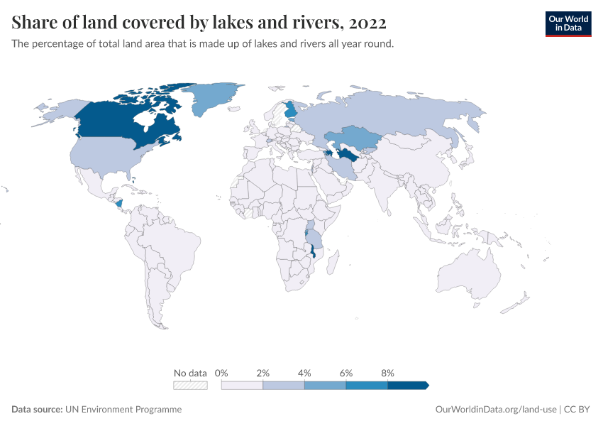 “Data Page: Share of land covered by lakes and rivers”. Our World in Data (2026). Data adapted from UN Environment Programme. Retrieved from https://auto-wildfires.owid.pages.dev:8789/20260130-180113/grapher/share-of-land-covered-by-lakes-and-rivers.html [online resource] (archived on January 30, 2026).How to cite this data