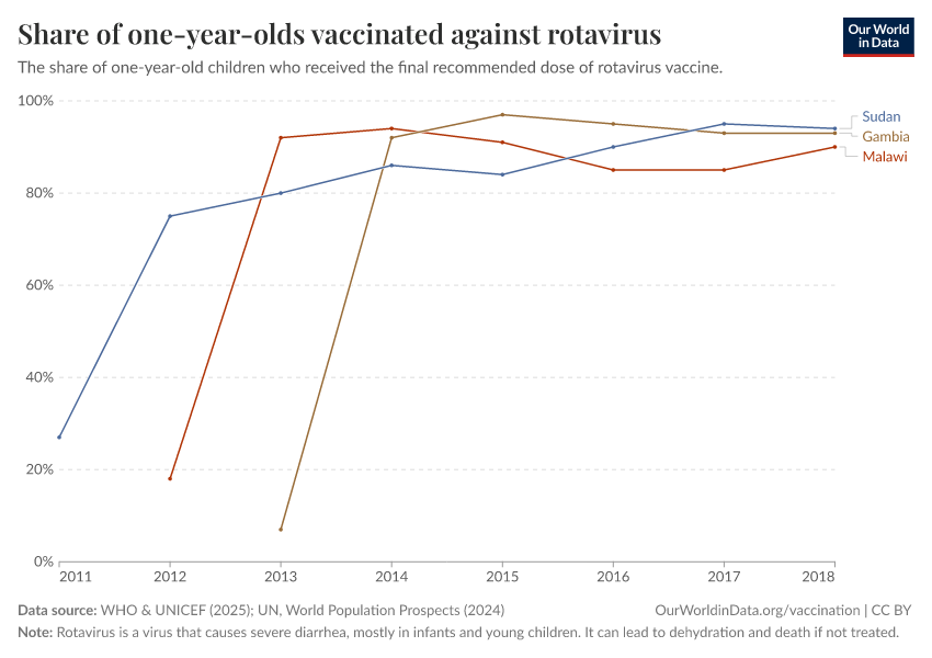 “Data Page: Share of one-year-olds vaccinated against rotavirus”, part of the following publication: Fiona Spooner, Saloni Dattani, Samantha Vanderslott, and Max Roser (2022) - “Vaccination”. Data adapted from WHO & UNICEF, United Nations. Retrieved from https://auto-wildfires.owid.pages.dev:8789/20260119-070102/grapher/share-of-one-year-olds-who-received-the-rotavirus-vaccine.html [online resource] (archived on January 19, 2026).How to cite this data