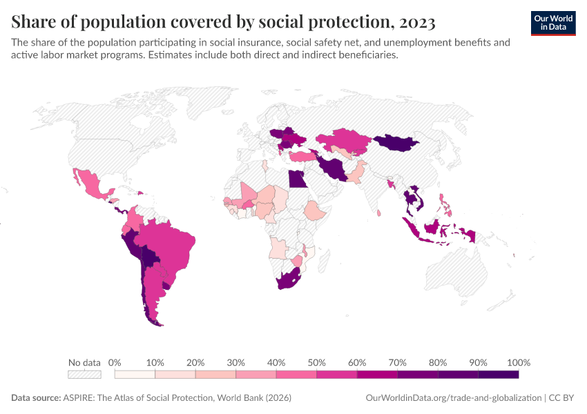 “Data Page: Share of population covered by social protection”. Our World in Data (2026). Data adapted from ASPIRE: The Atlas of Social Protection, World Bank. Retrieved from https://auto-wildfires.owid.pages.dev:8789/20260202-181317/grapher/share-of-population-covered-by-social-protection.html [online resource] (archived on February 2, 2026).How to cite this data