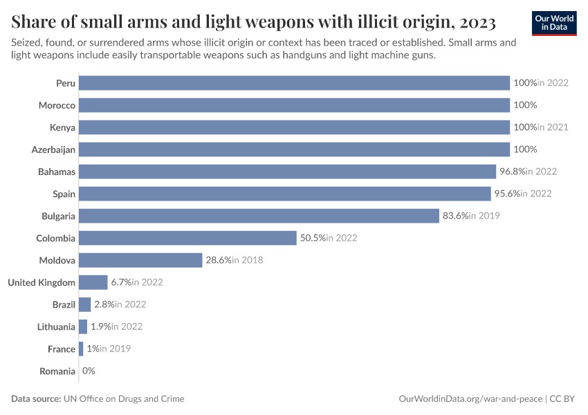 “Data Page: Share of small arms and light weapons with illicit origin”. Our World in Data (2026). Data adapted from UN Office on Drugs and Crime. Retrieved from https://auto-wildfires.owid.pages.dev:8789/20251204-144539/grapher/share-of-small-with-illicit-origin.html [online resource] (archived on December 4, 2025).How to cite this data